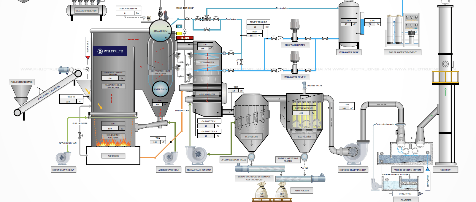 Xử lý khí thải: Khí thải sau buồng đốt đi qua hệ thống lọc bụi (cyclone, lọc túi vải, thiết bị lọc tĩnh điện ESP, tháp khử bụi ướt) và được quạt hút đẩy ra môi trường, đảm bảo khí thải đạt tiêu chuẩn QCVN