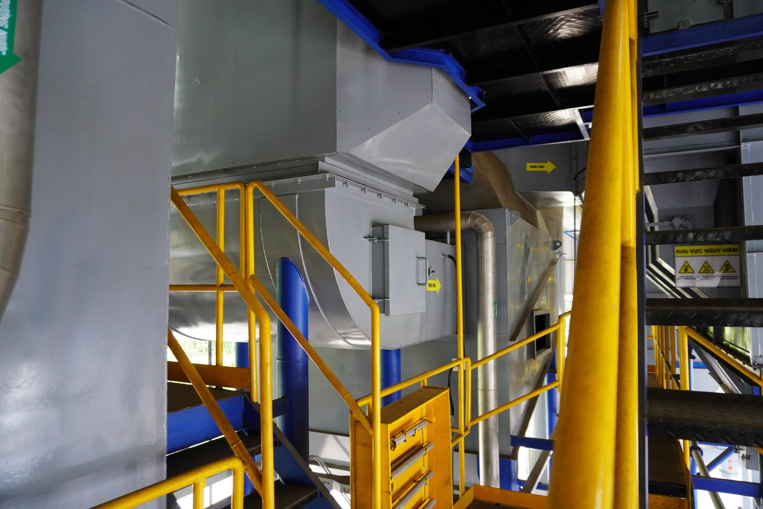 - Phần xỉ thải của nồi hơi tầng sôi được thu gom tự động. Riêng phần nhiệt độ khói thải sẽ được tận dụng để gia nhiệt cho không khí lẫn nước cấp vào lò. Sau đó, quạt hút từ bộ lọc bụi sẽ hút khói thải ra ngoài theo đường ống khói.
